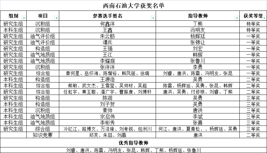 我院由冯明友老师指导的本科生20级资源勘查工程的王鑫获得本科组“沉积相分析”单项组特等奖,由丁熊老师指导的2023级地质资源与地质工程硕士研究生何鑫洋获得“沉积相分析”单项组特等奖。刘睿、唐洪、陈雷、冯明友、张昆、韩辉、丁熊、杨辉廷、张鲁川9位教师获得“优秀指导教师”称号。