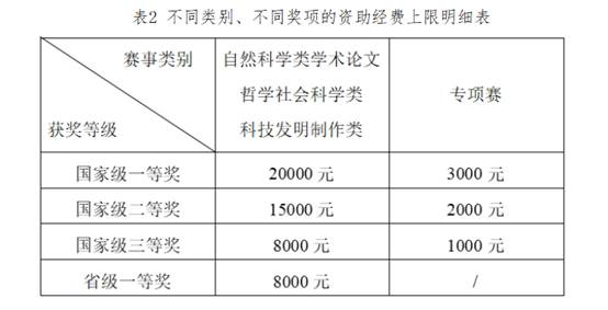 6.本次“挑战杯”校内选拔赛参赛作品的立项资助以成果为导向,资助获得省级一等奖及以上奖项的优秀作品。按照审批的作品经费预算(经费预算表见附件4,在资助经费上限和学校财务报销规定的范围内,资助经费实行实报实销原则。不同类别、不同奖项的资助经费上限见表2