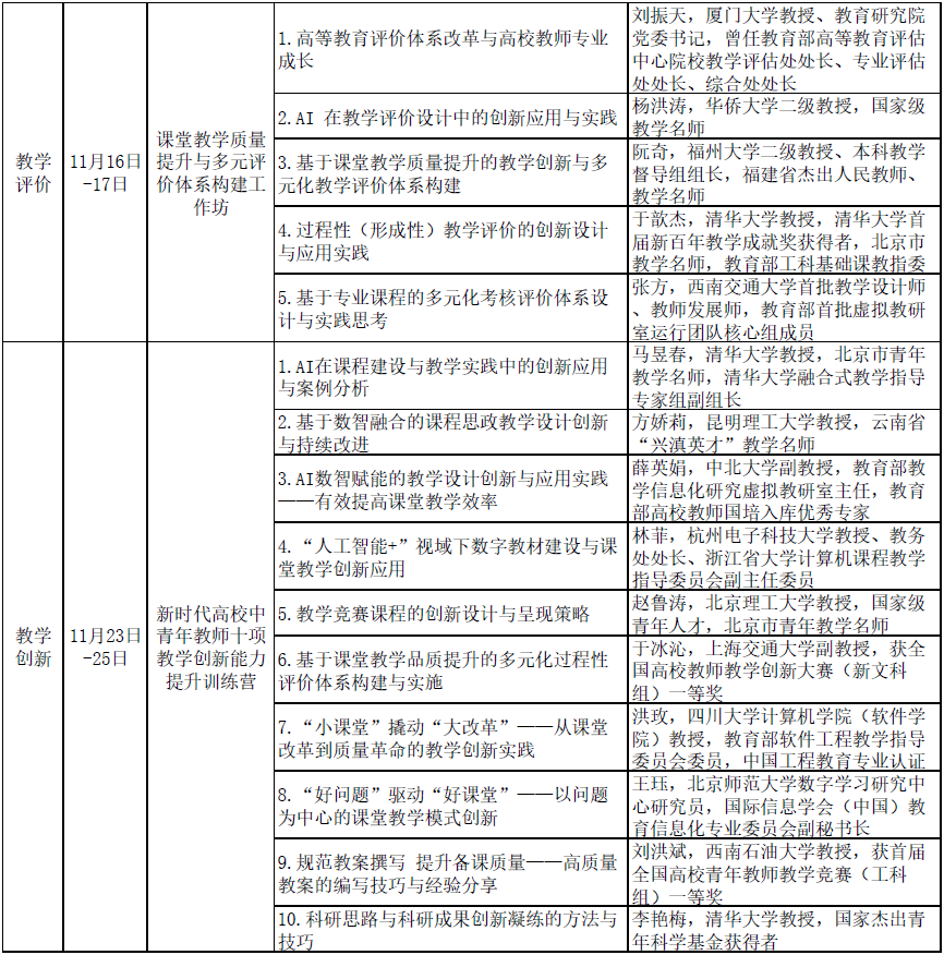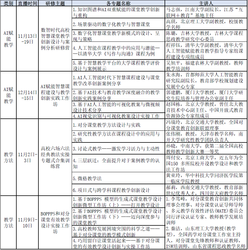 为深入贯彻党的二十大、二十届三中全会精神和习近平总书记关于教育的重要论述,积极响应并落实教育部发布的《深化新时代教育评价改革总体方案》、《关于深化本科教育教学改革 全面提高人才培养质量的意见》以及《教师数字素养》标准的相关要求,助力广大教师全面提升专业技能与教学创新能力,以适应数字化转型时期高等教育发展的新要求。教师教学发展中心从各大平台优选了6项专题培训,拟于11月-12月举办2-3场教师教学能力提升专项研修营。现对培训主题进行意见征集,有关事项如下: