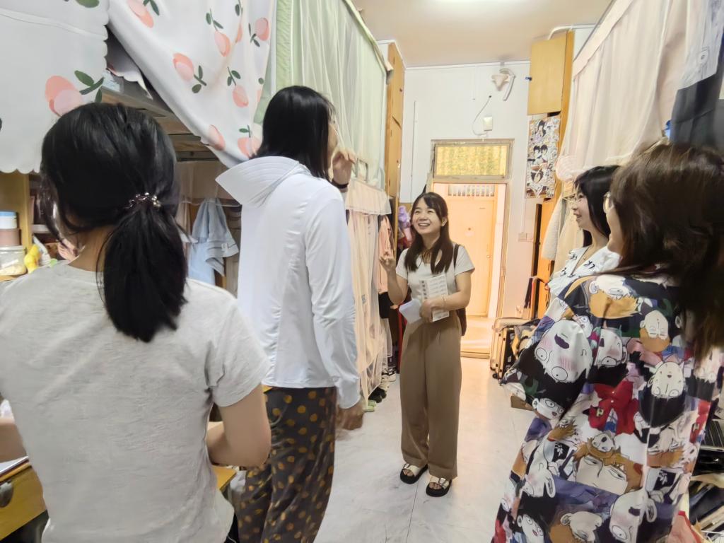 学生宿舍内,辅导员杨媚正在检查学生宿舍,辅导员程美容为同学们送上藿香正气液。杨媚鼓励同学们,“大家要以积极的心态迎接充满无限可能的新学期,经营好自己的学习和生活。”程美容嘱咐道:“最近气温攀升,大家要注意防暑哦!”
