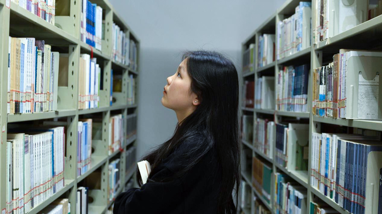 2023级工商管理专业的陈湘怡同学来到图书馆寻找感兴趣的图书,“新学期我要多看些书,养成阅读的习惯。”
