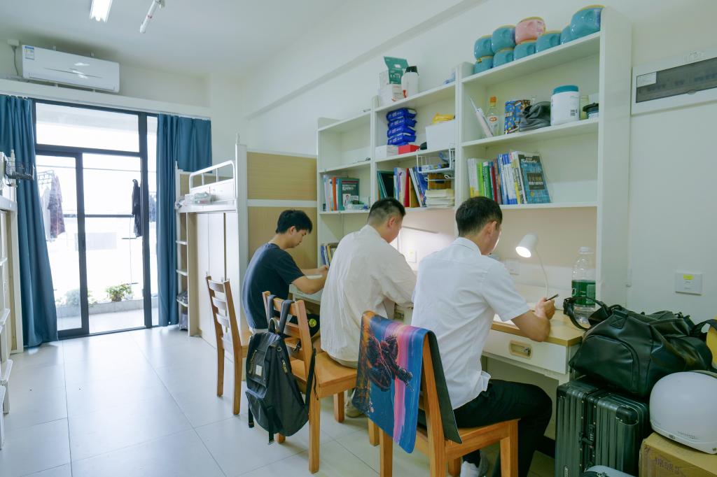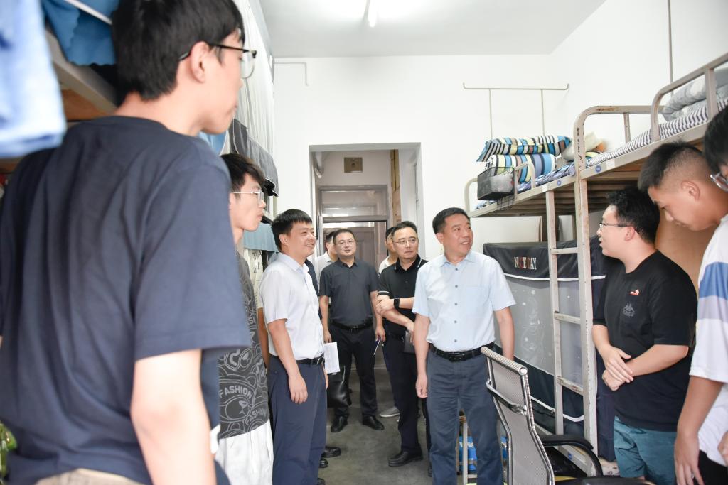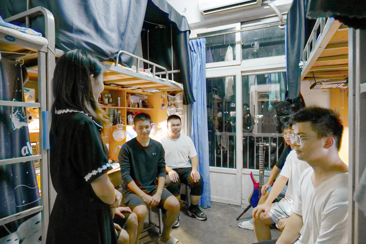 学生宿舍内,同学们正在做课前准备。郭建春走进寝室,与同学们亲切交流。“新学期第一堂课,我看你们干劲很足啊!高温天气肆虐,这一周是最艰难的,咱们坚持克服下!”