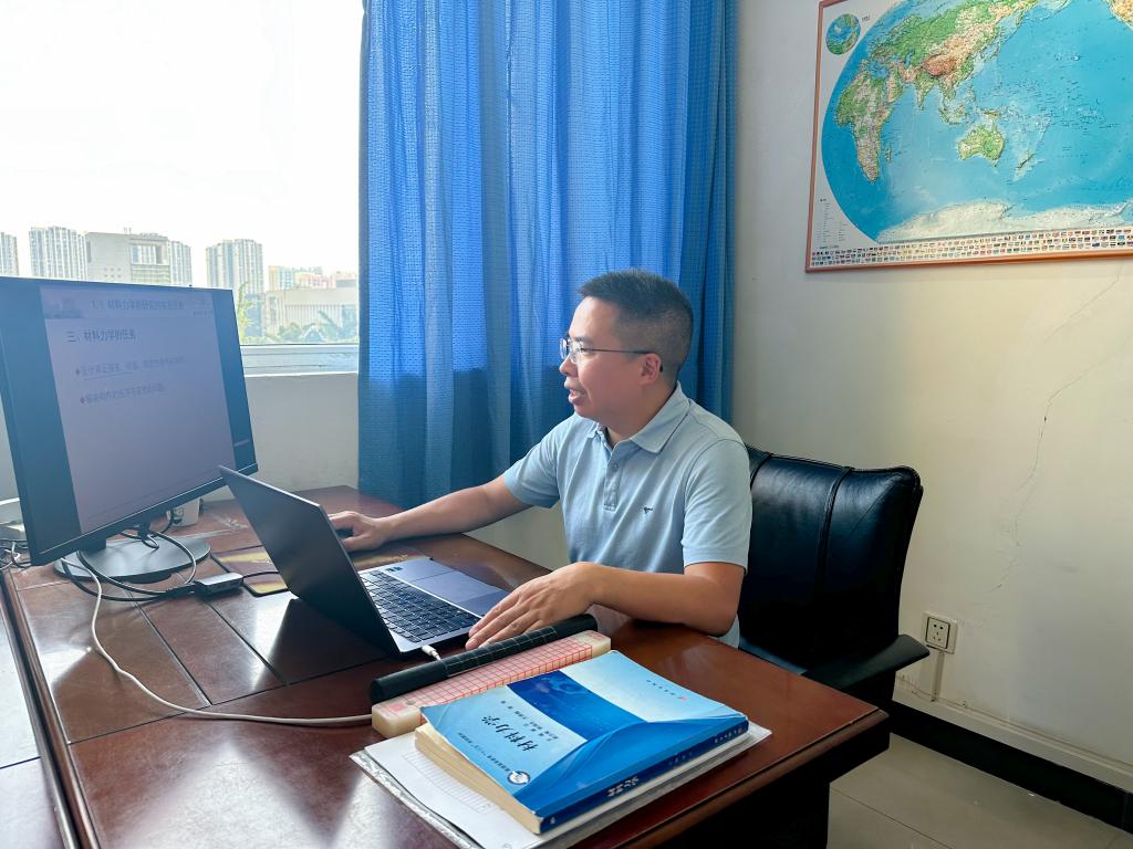 课前半小时,《材料力学》授课老师甯尤军坐在办公室电脑面前,提前进入昨天建好的“云课堂”。甯尤军老师说到:“最近高温天气,学校让我们暂时线上上课,我又当起了课堂‘主播’。”