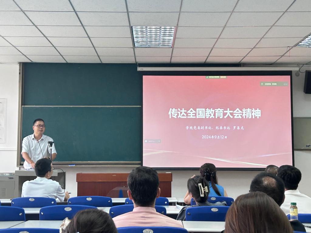 学院领导班子、全体教职工参加学习会,学院党委副书记、纪委书记罗昌龙领学了全国教育大会精神。