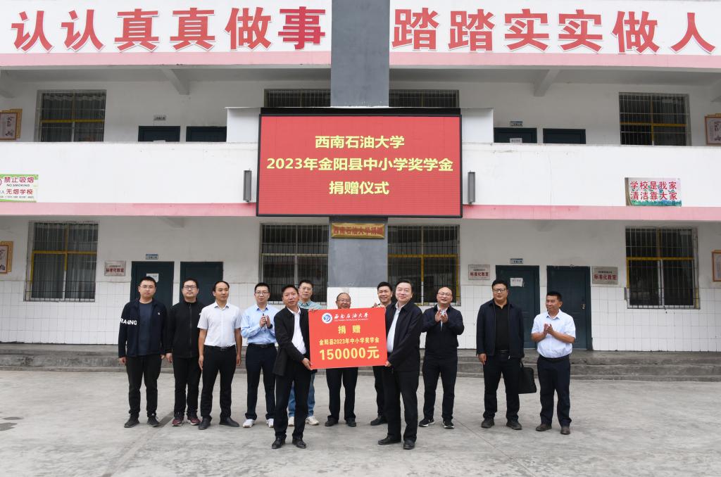 在务科小学,举行了2023年金阳中小学奖学金捐赠仪式。陈永灿代表学校向金阳县教体科局捐赠了15万元奖助学金,用于奖励刻苦努力、品学兼优的中小学优秀学生。在务科村党群服务中心,陈永灿代表学校向务科村捐赠了40万元,作为2023年定点帮扶第一批项目资金。
