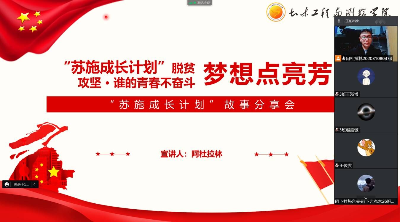 树立远大理想,彰显青春风貌。为激励“苏施”成长班同学不惧困难,努力学习,2021年10月16日、18日土木工程与测绘学院在明志楼A413、腾讯会议召开了线上线下“苏施”成长计划之成长分享会。2020级工程管理专业学生阿杜拉林作为代表分享了自己的学习与成长经历。