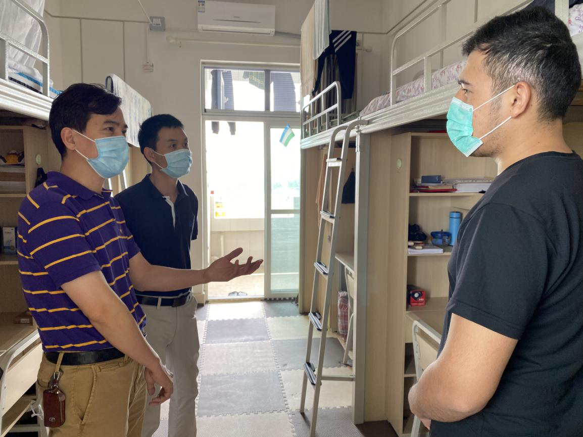 在学生公寓24栋634,学院领导走访了乌兹别克斯坦学生DILSHODBEK,了解疫情期间学生在校园内的学习、饮食、心理和文化交流情况,关心询问学生在校期间存在的困难。DILSHODBEK表示,学校的疫情防控措施非常到位,这让他感到非常安全,虽然暂时无法自由出入校门,但是学校的防疫工作非常值得理解和支持,他表示在校期间要认真学习中文,期待下一个春天到来疫情消散,他也成为一个中国通。