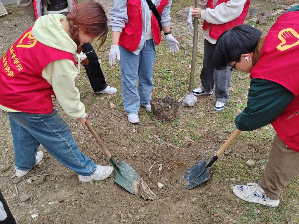 3月12日下午,活动如期开始。负责人首先讲解了此次劳动的具体流程,再根据树苗的数量将志愿者分为若干小组,分别去往不同的区域进行除草、植树。活动中,同学们热情高涨,干劲十足,奋力挥动铁锹、认真扶正树苗、提桶浇水、施肥沃土,确保每一棵树苗都能成活。大家分工协作、相互配合,各个环节衔接有序,呈现出一派热火朝天的劳动景象。在同学们的共同努力下,一株株新栽的树苗迎风而立,在和煦的春风中散发着朝气蓬勃,为绿色校园增添了勃勃生机。