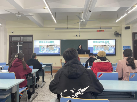 本期训练班共10个课时,1个课时为120分钟,其中理论教学4课时、集训实训4课时、测评反馈2课时,教学过程以普通话听、说能力强化训练为主,普通话语音基础理论知识、语言学相关知识的教学为辅,并配合开展口语发音练习、朗读、有稿演讲等生动活泼的教学形式进行。艺术学院赵邦宇和人事处王瑞担任本期带训导师。