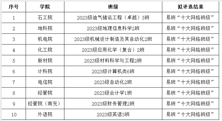 为进一步深化“互联网+学生成长”育人理念,提高易班建设创造力、增强班级凝聚力,引导广大学生主动使用易班,培育易班创建的先进典型,本着公平、公正、公开的原则,经自愿申报、学院推荐、复赛选拔、决赛评选等程序,根据专业评审、大众评委和网上投票得分,2023-2024学年(第八届)“易班十大网络班级”创建与评选活动结果已产生。具体结果如下(排名不分先后):