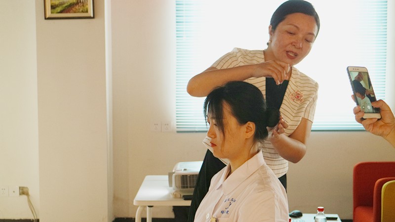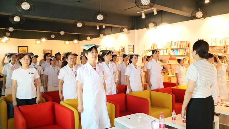 随后,林莉讲解了仪容礼仪、服饰礼仪、仪态标准,分别指导女性医护人员与男性医生正确做法,现场气氛分外活跃。一名护士被邀请上台,做模特示范如何用发网盘出标准发髻;“保持眼神微笑”,全体人员起立,跟随老师指挥,背靠背、保持身体“一”字状、顶住杂志,学习良好体态;当林莉示范礼仪操时,在场人员纷纷拿出手机拍摄记录——随着悠扬的曲子,林莉老师整理头发、检查衣服、露出微笑、右边指引、蹲……举手投足彰显出气质与专业,赢得现场一片掌声。
