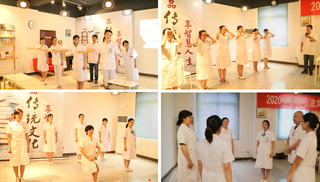 经过近半小时的练习,校医院的医护人员们上台表演礼仪操,将活动推向高潮。住院部主任邹剑戎、医技科主任施伟、办公室主任郑伟蓉、门诊部主任赵辉分别带领各自的队伍上台,跟着音乐节奏,向右指引、向左指引、“眼手不一”、“高腿在前”、“15°鞠躬、30°鞠躬、45°鞠躬”……医护人员们动作规范优雅,整齐划一,将林莉老师所教充分吸收化为己用,结合过往服务经验,四个队伍不相上下,展现出白衣天使自信、专业的风采。