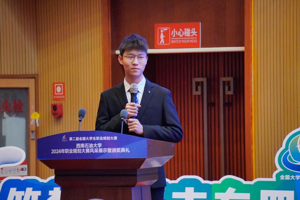 教育部就业调查四川分中心执行副主任王海军代表评委发言。他谈到,参赛选手以精彩的展演展示了个人清晰的职业规划与丰硕的行动成果,体现了学校人才培养的质量。希望同学们对标大赛规则调整作品,争取在更高级别赛事取得佳绩。