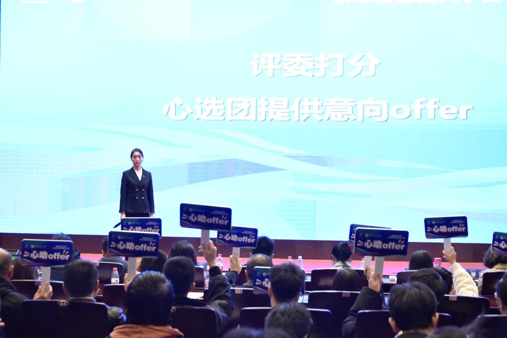 展演环节,刘竹溪、郭阳、毛雯等9位同学分成长赛道、就业赛道(本科生组)、就业赛道(研究生组)三个赛道进行职业生涯发展展示,专家现场对选手进行模拟面试与考察,企业心选团专家通用过举牌为选手送出意向offer。